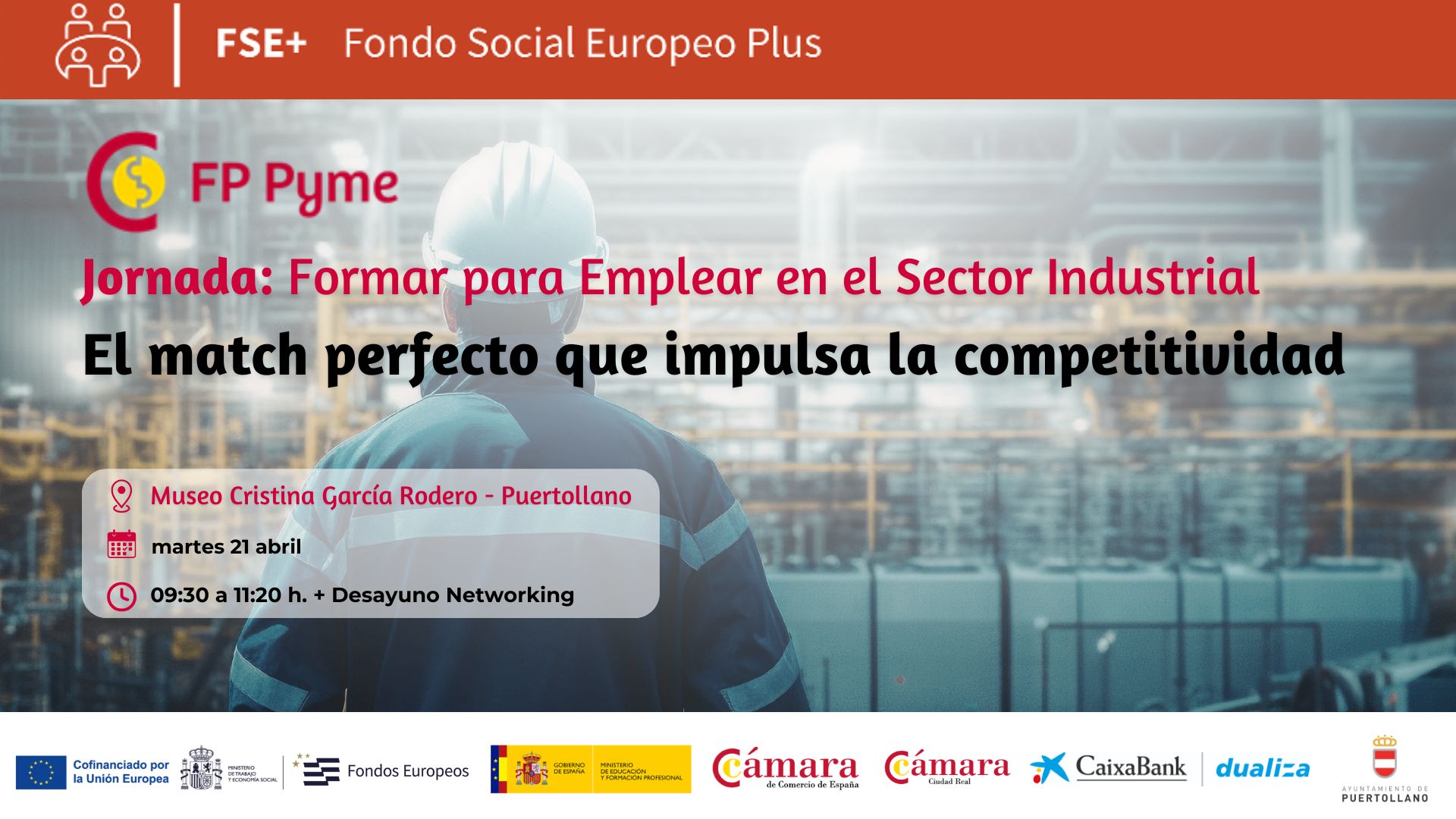 La Cámara de Comercio de Ciudad Real, en el marco del programa FP Pyme, organiza la jornada Formar para emplear en el Sector Industrial "El match perfecto que impulsa la competitividad", un encuentro dirigido a empresas, centros educativos y agentes del territorio interesados en fortalecer la conexión entre la Formación Profesional y las necesidades reales del tejido industrial.